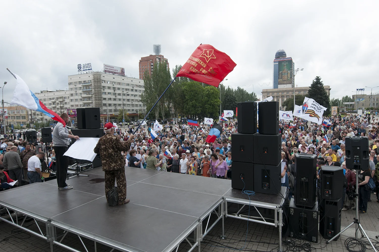 DNR soldier reading the newspaper as his comrades patrol Lenin Square