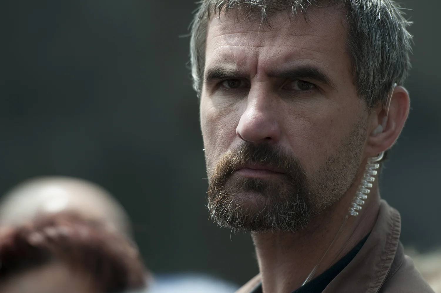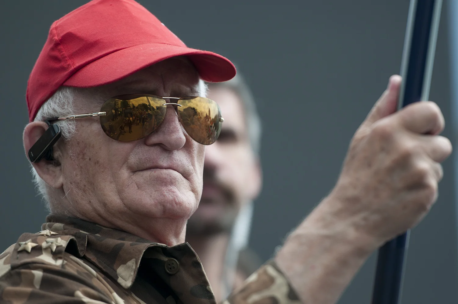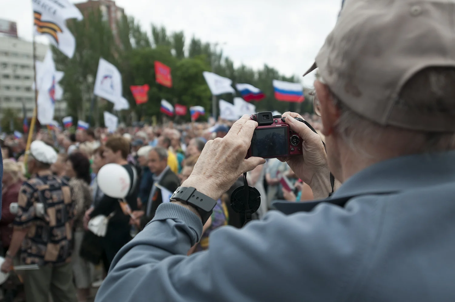 Man looking at three separatists solider who are laughing at the view of burned Ukrainian flag