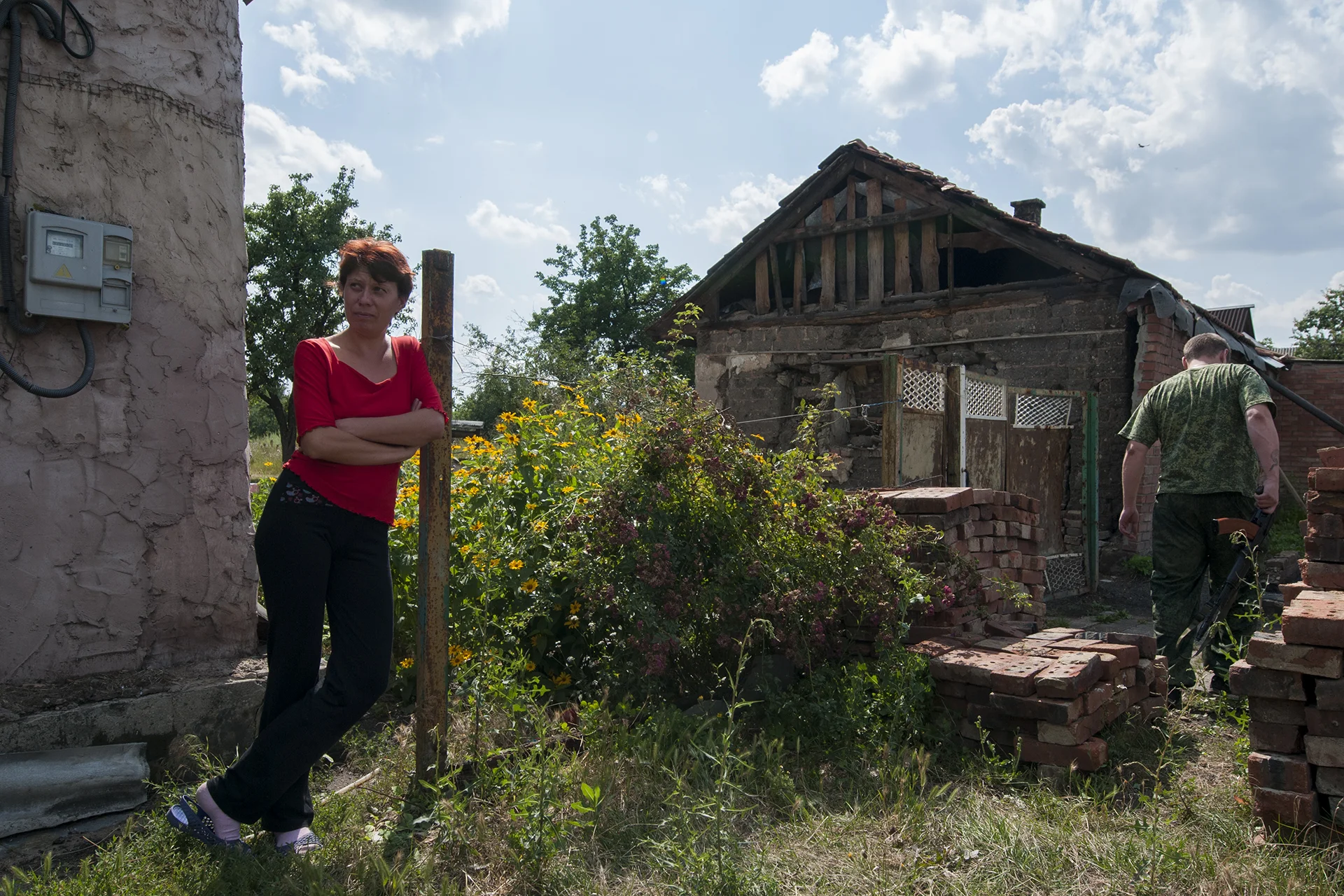 Woman standing next to her house as Aleksei walks towards the front line position hold by his men